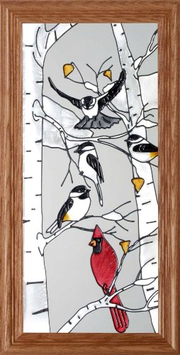 Feature аbουt WINTER BIRDS Suncatcher Window BIRCH TREE 11×22 Glass Panel Framed :